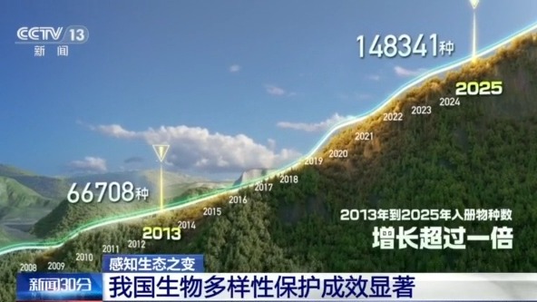 如今,《中國(guó)生物物種名錄》上“入冊(cè)”的生物種數(shù),從2013年的6.7萬種,增長(zhǎng)到2025年的14.8萬種,增長(zhǎng)超過1倍。近500種野生動(dòng)植物的受威脅等級(jí)出現(xiàn)下降。