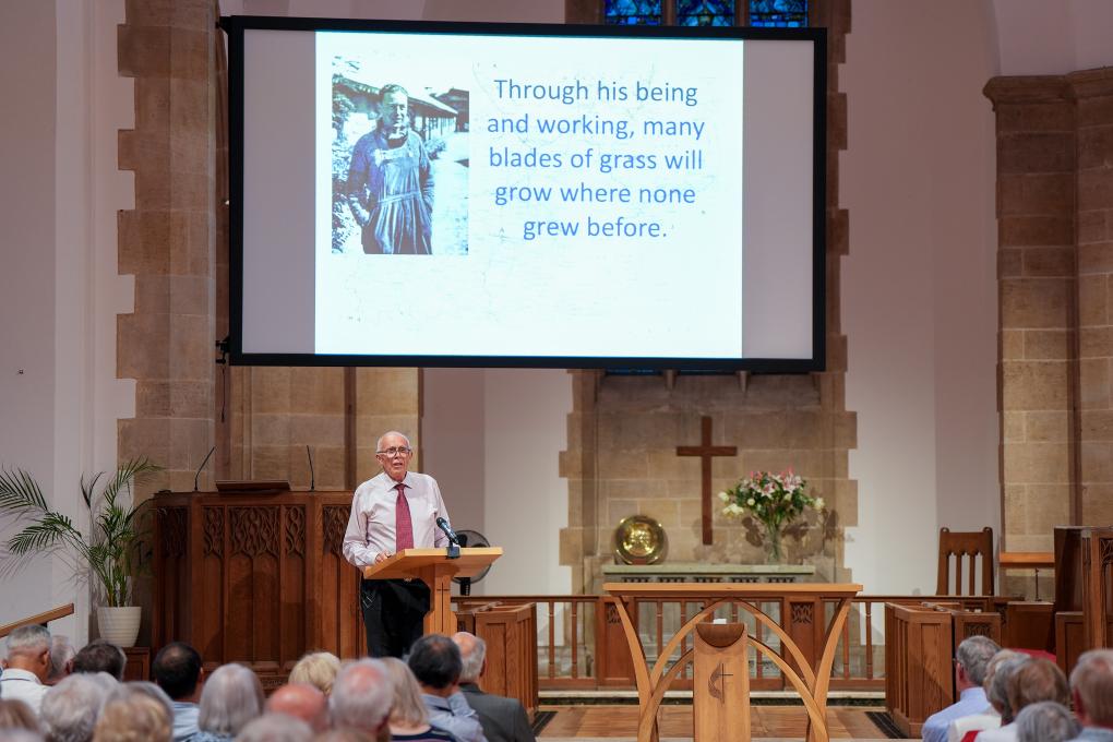 7月22日晚,英國(guó)赫特福德郡哈彭登鎮(zhèn),何克逝世80周年紀(jì)念活動(dòng)現(xiàn)場(chǎng),座無(wú)虛席。屏幕上,一幀幀畫(huà)面定格下何克在中國(guó)的身影與足跡。講臺(tái)上,何克的外甥馬克·艾爾溫·托馬斯深情講述80多年前的往事。