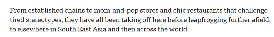文章說,中國烹飪技藝源遠(yuǎn)流長、博大精深,一桌美食盛宴或許正是中國最有效卻又最被低估的吸引力所在。還是以新加坡為例,商場(chǎng)、公交和地鐵站里,搭配著中國成語的中國美食巨幅亮眼廣告不時(shí)閃現(xiàn)。從連鎖巨頭到夫妻小店,再到顛覆刻板印象的時(shí)尚餐廳,這些中國美食品牌在向東南亞乃至全球擴(kuò)張前,都已在這個(gè)國際旅游城市嶄露頭角。