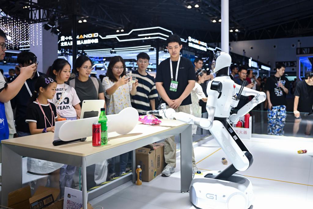 7月29日,上海2025世界人工智能大會,參觀者在觀賞一款可用于零售、工業(yè)等多種場景的機器人。新華社記者 陳浩明 攝