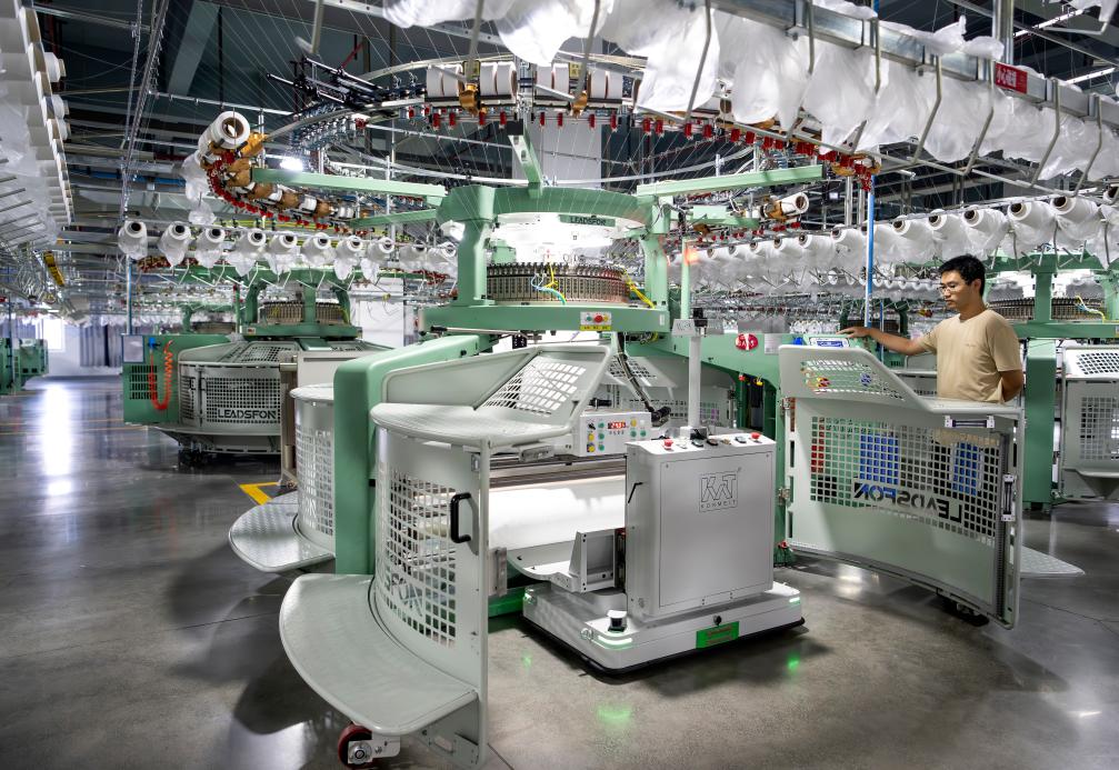 7月24日,一名工人在泉州聯(lián)興發(fā)針織織造有限公司的萊卡+5G智能數(shù)字化生產車間操控機器人工作。新華社記者 魏培全 攝