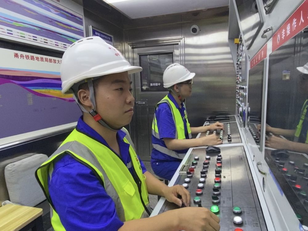 圖為中鐵十四局甬舟鐵路項目盾構機長栗晨(左一)在盾構機駕駛室內操作。新華社記者魏一駿 攝