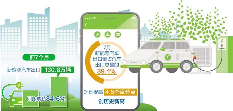 值得一提的是,新能源汽車出口數(shù)量增長明顯。前7個月,新能源汽車出口130.8萬輛,同比增長84.6%,成為外貿(mào)增長的亮點。