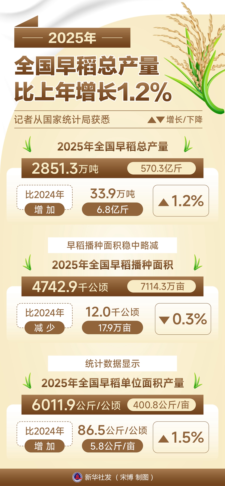統(tǒng)計數(shù)據(jù)顯示,2025年全國早稻單位面積產量6011.9公斤/公頃(400.8公斤/畝),比2024年增加86.5公斤/公頃(5.8公斤/畝),增長1.5%。