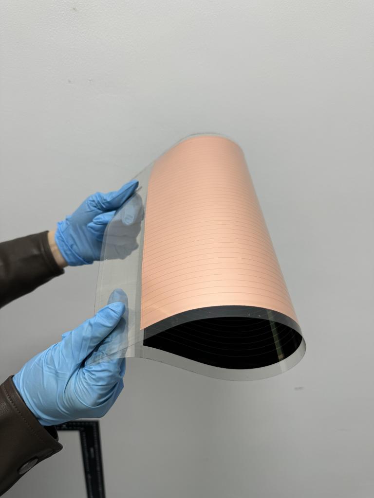 今年,校企聯(lián)合團(tuán)隊(duì)成功將原位涂層技術(shù)轉(zhuǎn)移到工業(yè)級狹縫涂布設(shè)備上,實(shí)現(xiàn)寬帶隙鈣鈦礦薄膜在800多平方厘米的柔性基板上一次成型。