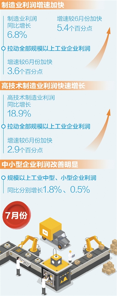 高技術(shù)制造業(yè)利潤快速增長,引領(lǐng)作用明顯。7月份,高技術(shù)制造業(yè)利潤由6月份下降0.9%轉(zhuǎn)為增長18.9%,拉動(dòng)全部規(guī)模以上工業(yè)企業(yè)利潤增速較6月份加快2.9個(gè)百分點(diǎn),引領(lǐng)作用明顯。其中,航空航天器及設(shè)備制造行業(yè)利潤增長40.9%,生物藥品制造、化學(xué)藥品制劑制造等行業(yè)利潤分別增長36.3%、6.9%。