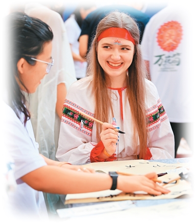 8月6日,“上合之約·絲路津彩”上合國家青年學(xué)生“萬花筒”文化市集在天津舉行。圖為青年學(xué)生體驗(yàn)書法。