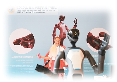 7月11日,嘉賓在2025上合組織數(shù)字經(jīng)濟(jì)論壇上體驗(yàn)操控人形機(jī)器人。