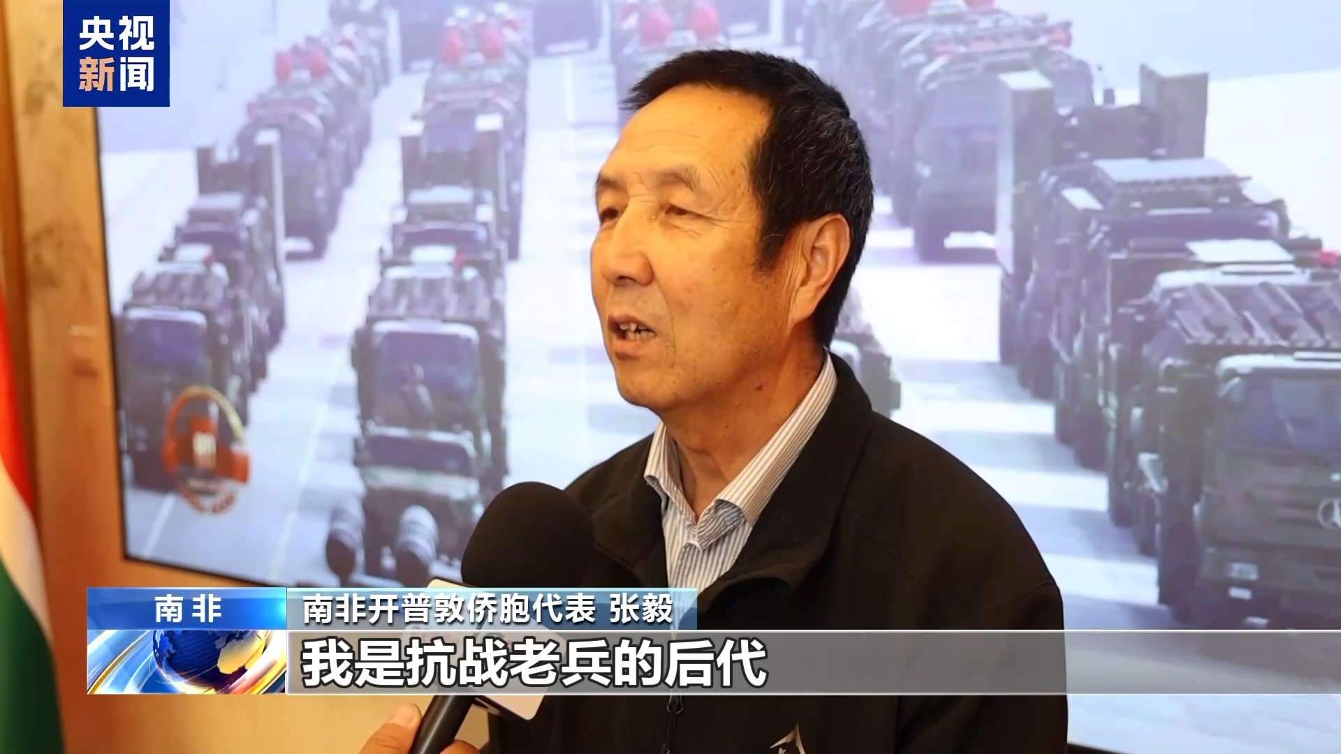南非開普敦僑胞代表 張毅:我是抗戰(zhàn)老兵的后代,我父親1941年在冀中平原加入八路軍,曾參與多場戰(zhàn)斗。作為未經(jīng)歷戰(zhàn)爭的新一代,我們一定要繼承老一代革命先烈的精神,發(fā)揚(yáng)他們的必勝信念,為世界和平貢獻(xiàn)力量。