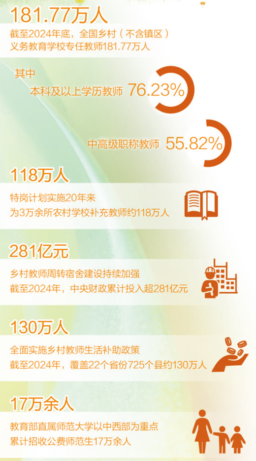截至2024年底,全國(guó)鄉(xiāng)村(不含鎮(zhèn)區(qū))義務(wù)教育學(xué)校專(zhuān)任教師共181.77萬(wàn)人。扎根、堅(jiān)守,他們用愛(ài)心和智慧,點(diǎn)亮萬(wàn)千鄉(xiāng)村孩子的人生夢(mèng)想。