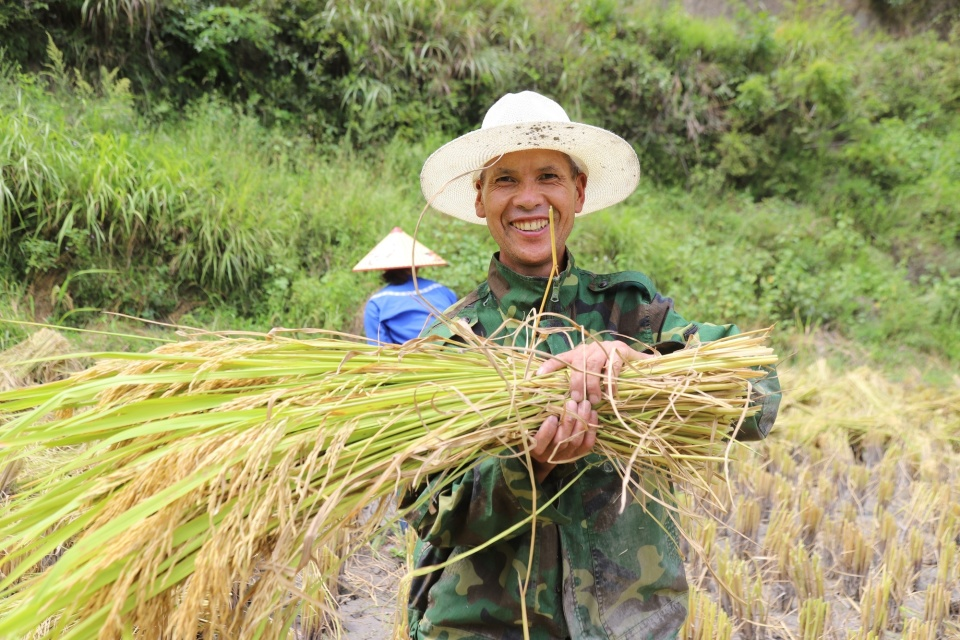 貴州省黔東南州鎮(zhèn)遠(yuǎn)縣報(bào)京鄉(xiāng)的農(nóng)戶展示稻穗,臉上洋溢著笑容(央廣網(wǎng)發(fā) 張佳怡 攝)