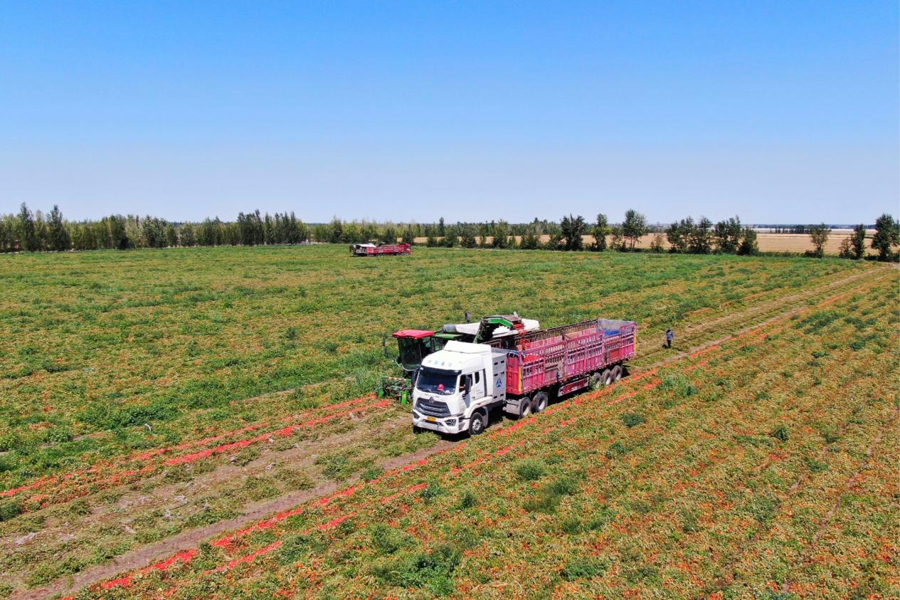 吉木薩爾縣三臺鎮(zhèn)的1200余畝加工番茄迎來了豐收季。在羊圈臺子村,種植戶俞瑞海家的300畝番茄地里,現(xiàn)代化采收機(jī)械正來回穿梭。