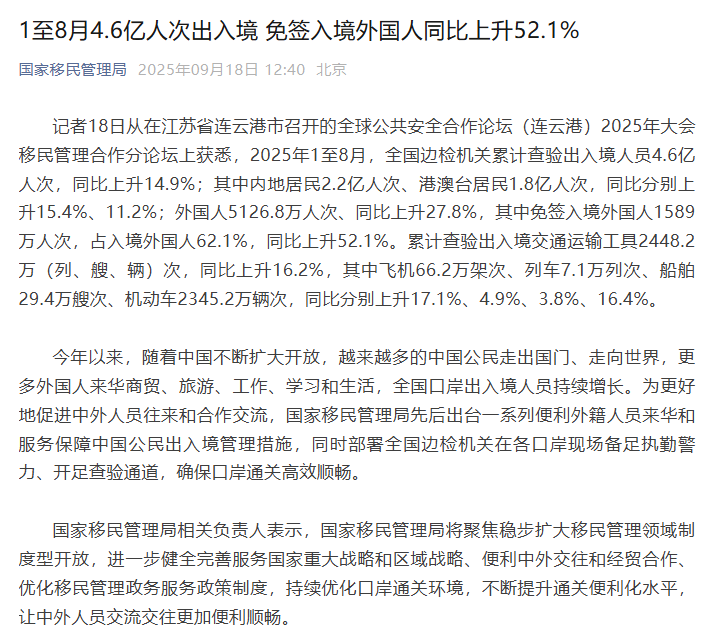 記者18日從在江蘇省連云港市召開的全球公共安全合作論壇(連云港)2025年大會移民管理合作分論壇上獲悉,2025年1至8月,全國邊檢機關(guān)累計查驗出入境人員4.6億人次,同比上升14.9%;其中內(nèi)地居民2.2億人次、港澳臺居民1.8億人次,同比分別上升15.4%、11.2%;外國人5126.8萬人次、同比上升27.8%,其中免簽入境外國人1589萬人次,占入境外國人62.1%,同比上升52.1%。累計查驗出入境交通運輸工具2448.2萬(列、艘、輛)次,同比上升16.2%,其中飛機66.2萬架次、列車7.1萬列次、船舶29.4萬艘次、機動車2345.2萬輛次,同比分別上升17.1%、4.9%、3.8%、16.4%。