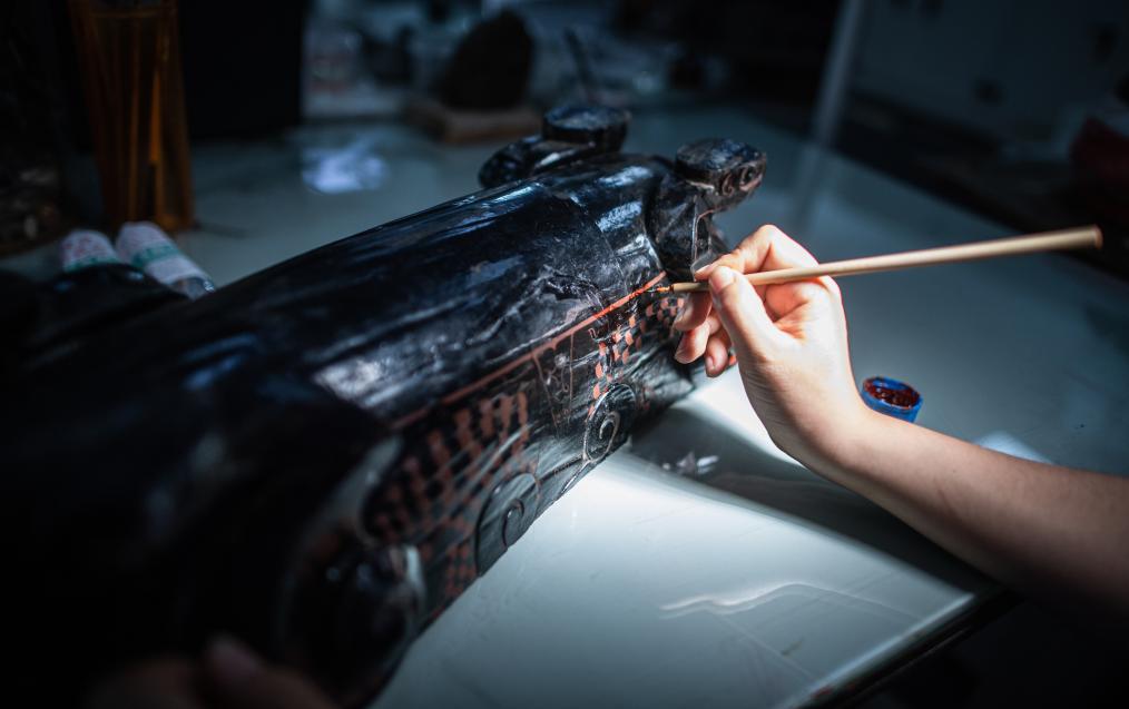 在荊州文物保護中心,文物修復人員修復一件戰(zhàn)國獸形酒具盒。新華社記者肖藝九 攝