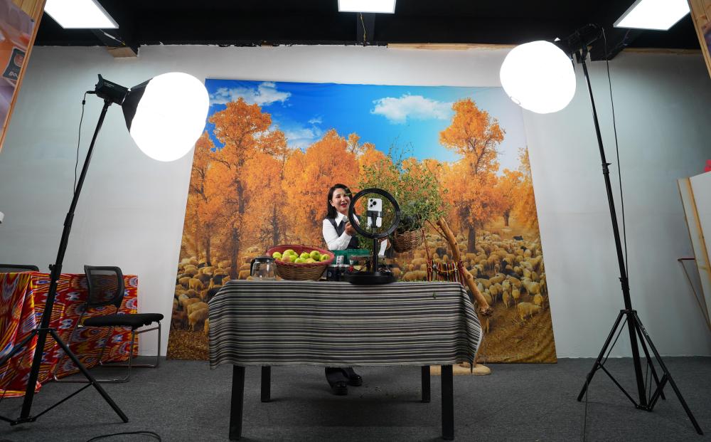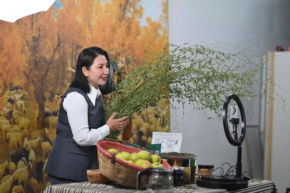 9月19日,尉犁縣電商協(xié)會負責(zé)人米日阿依·阿西木在達西村的電商基地直播推介達西村農(nóng)產(chǎn)品。近年來,達西村構(gòu)建“農(nóng)戶生產(chǎn)+企業(yè)加工包裝+電商銷售+物流配送”全產(chǎn)業(yè)鏈,為縣域經(jīng)濟發(fā)展培養(yǎng)孵化本土直播電商人才,促進傳統(tǒng)產(chǎn)業(yè)轉(zhuǎn)型升級。