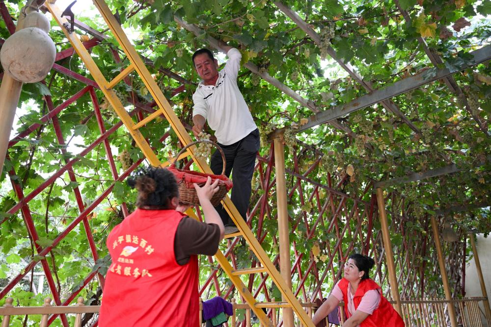 9月18日,達西村村干部入戶幫助村民采摘葡萄。近年來,達西村充分挖掘房前屋后閑置土地及荒廢地塊,逐步擴大特色林果種植面積,引導(dǎo)村民增收。