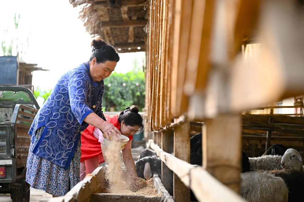 9月18日,達西村村干部卡麥爾汗·蘇來曼(后)入戶幫助村民喂羊。