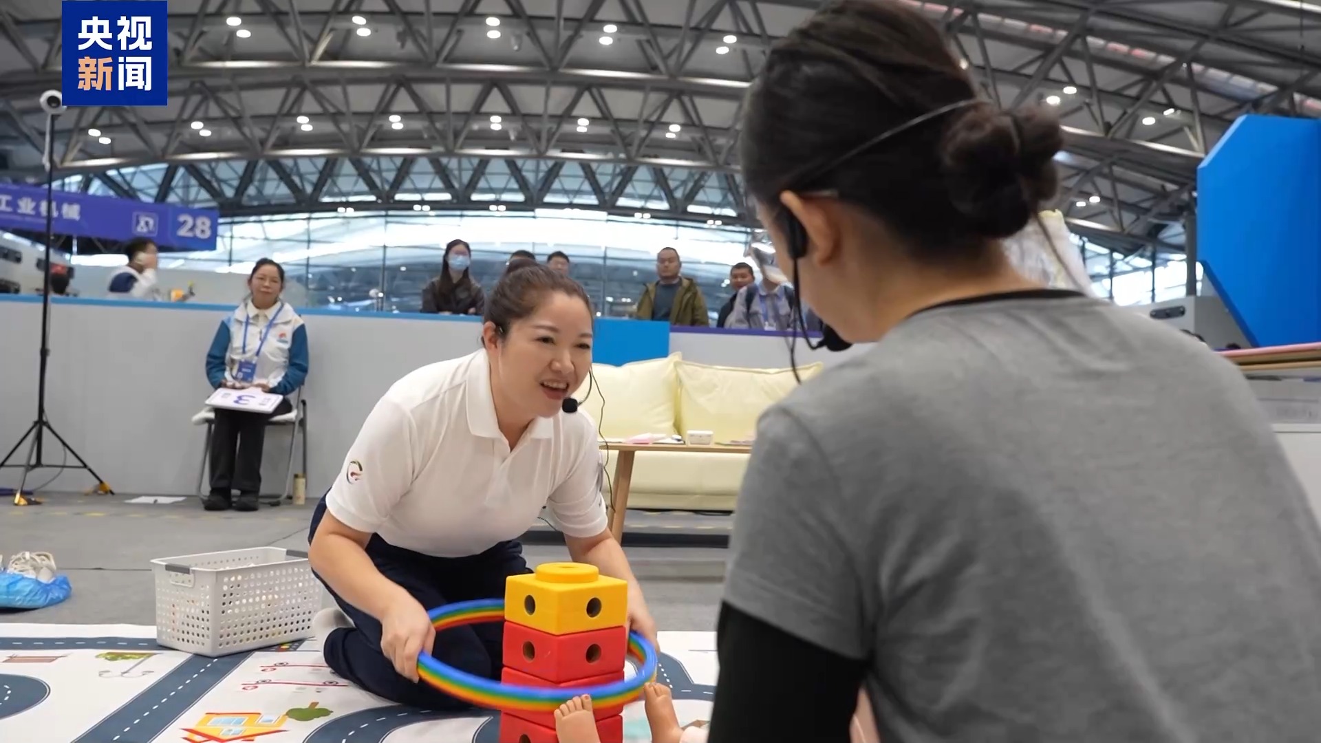 賽場上,一個個格子間按照真實居家場景布置,選手們按照流程,完成從上門拜訪、嬰兒互動、游戲設(shè)計、家長交流等系列服務(wù)工作。記者注意到,這次比賽創(chuàng)新引入會哭鬧的智能化模擬嬰兒,選手抱姿不對、饑餓都會有數(shù)據(jù)反饋,考驗選手的回應(yīng)性照顧能力,同時邀請了一些嬰幼兒家長進(jìn)行配合互動。
