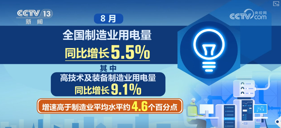 數據顯示,8月,全國制造業(yè)用電量同比增長5.5%。其中,高技術及裝備制造業(yè)用電量同比增長9.1%,增速高于制造業(yè)平均水平約4.6個百分點。
