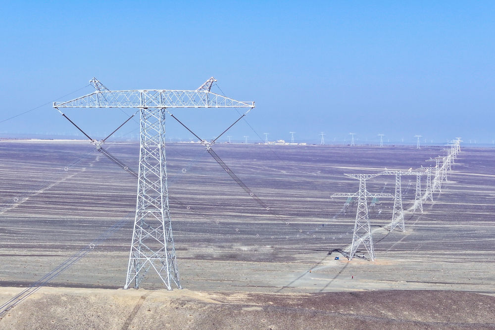 在新疆昌吉回族自治州木壘哈薩克自治縣拍攝的±1100千伏昌吉-古泉特高壓直流輸電線(xiàn)路(7月5日攝)。