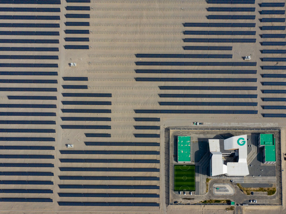 9月22日在新疆巴音郭楞蒙古自治州若羌縣拍攝的中國(guó)綠發(fā)新疆中綠電若羌400萬(wàn)千瓦光伏項(xiàng)目(無(wú)人機(jī)照片)。該項(xiàng)目每年可發(fā)電69.08億千瓦時(shí),滿(mǎn)足南疆200萬(wàn)戶(hù)家庭用電需求,減排208.24萬(wàn)噸煤耗。