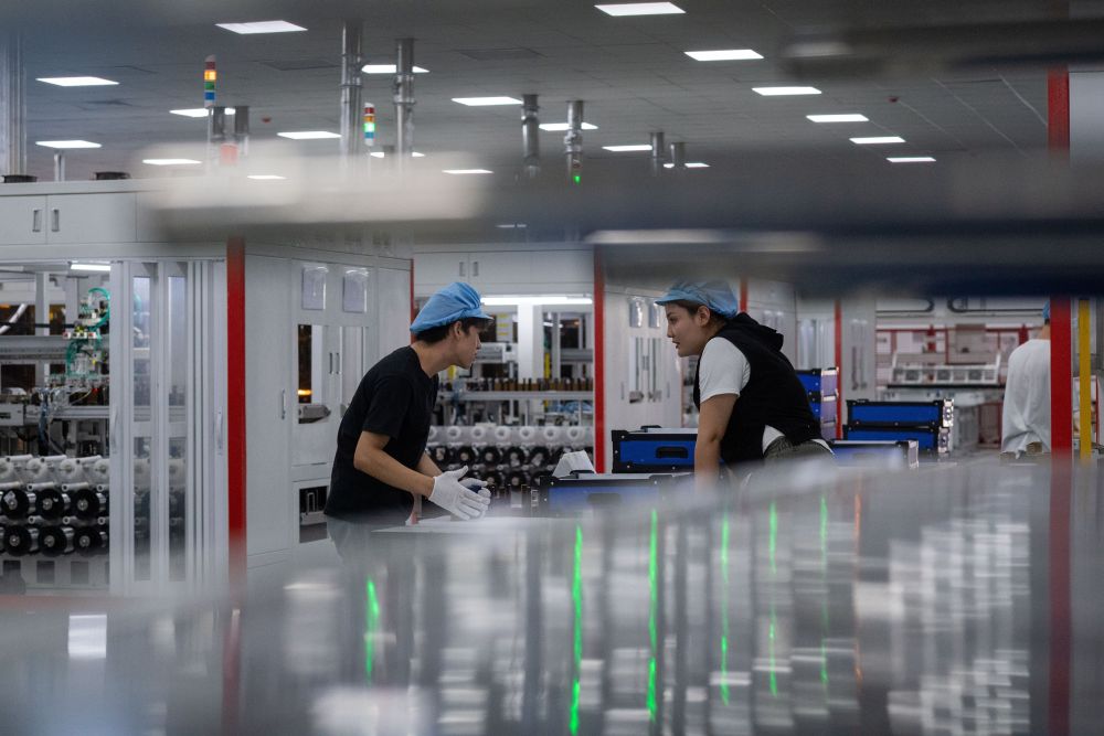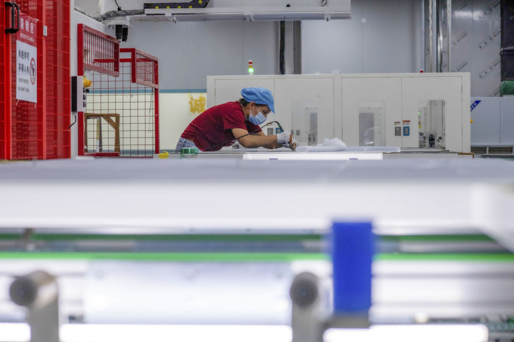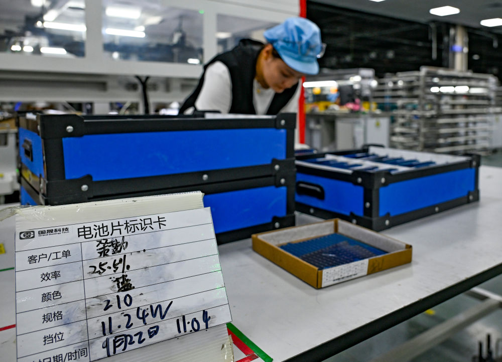 9月22日,工人在新疆巴音郭楞蒙古自治州若羌縣的國(guó)晟企誠(chéng)新能源有限公司生產(chǎn)光伏電池片。