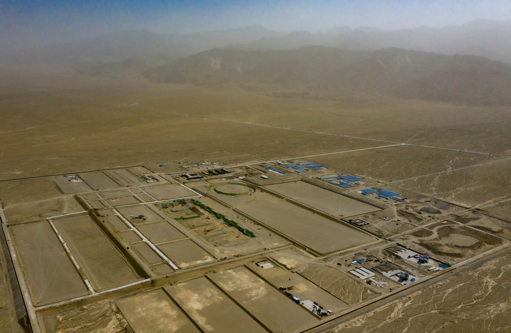 9月22日在新疆巴音郭楞蒙古自治州若羌縣拍攝的三峽集團(tuán)“疆電外送”第四通道電源項(xiàng)目施工現(xiàn)場(chǎng)(無(wú)人機(jī)照片)。