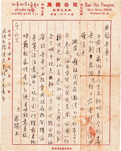 廼者兄獲祖國政府邀請,已決于本月下旬參與“緬甸華僑回國觀光團(tuán)”回國一行,預(yù)決先到北京參加國慶大典,后即到各大城市觀光,料十一二月間可能回抵福建,故吾弟可由報(bào)章或政府機(jī)關(guān)探詢吾等(須注意“緬甸”之觀光團(tuán))行程,前來把晤,藉敘家情,是切勿誤。