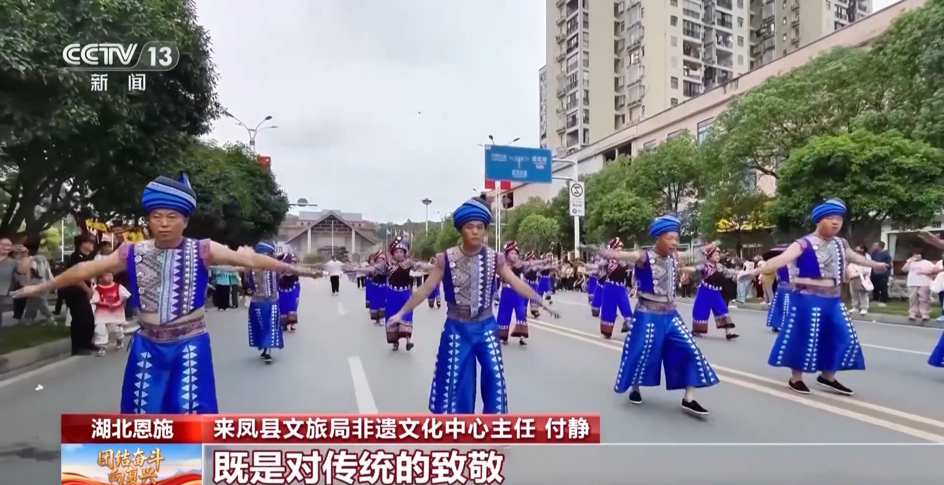 來鳳縣文旅局非遺文化中心主任 付靜:國慶是舉國歡慶的日子,用擺手舞巡游的形式慶祝,既是對傳統(tǒng)的致敬,也是對新時代的禮贊。