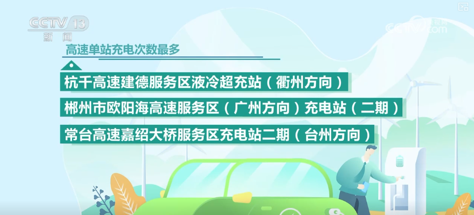 高速單站充電次數(shù)最多的是杭千高速建德服務區(qū)液冷超充站(衢州方向)、郴州市歐陽海高速服務區(qū)(廣州方向)充電站(二期)、常臺高速嘉紹大橋服務區(qū)充電站二期(臺州方向)。