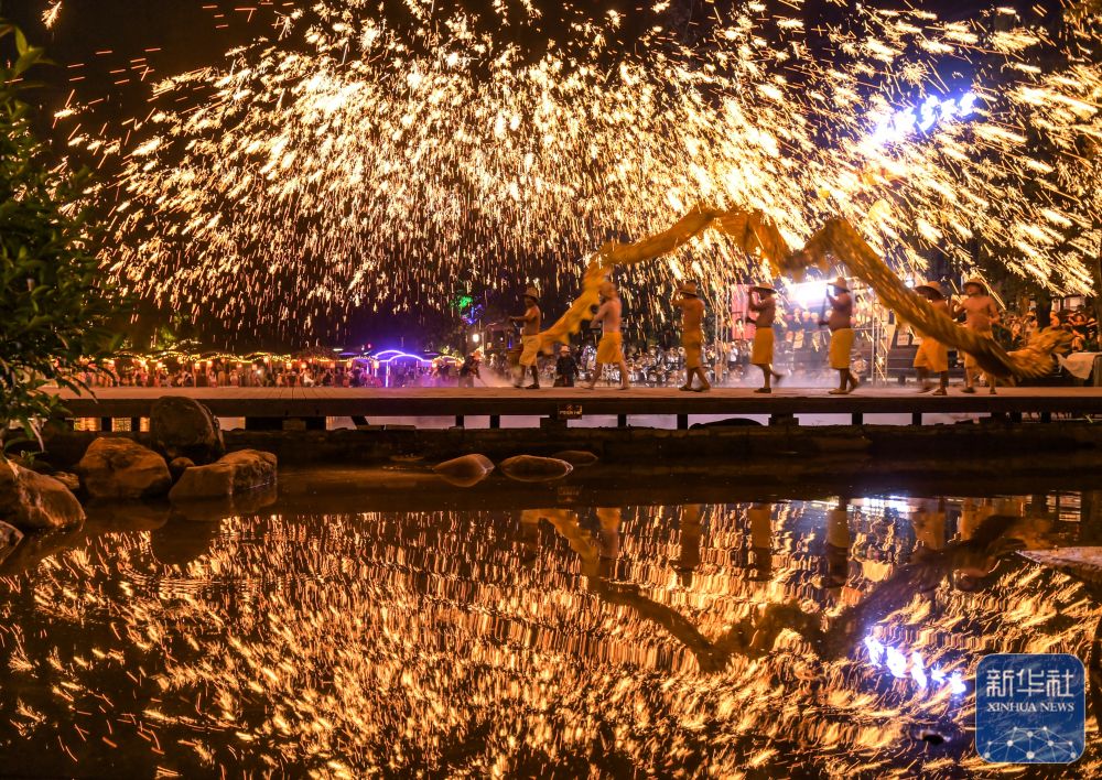 ↑ 10月5日晚,在四川省成都市雙流區(qū)黃龍溪古鎮(zhèn),民間藝人為游客表演非遺“火龍燈舞”。新華社發(fā)(李向雨攝)