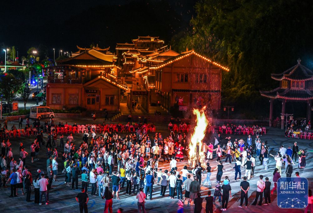 ↑ 10月5日晚,在貴州省晴隆縣阿妹戚托小鎮(zhèn),游客與當(dāng)?shù)厝罕妵艋鸸参琛P氯A社記者 楊文斌 攝