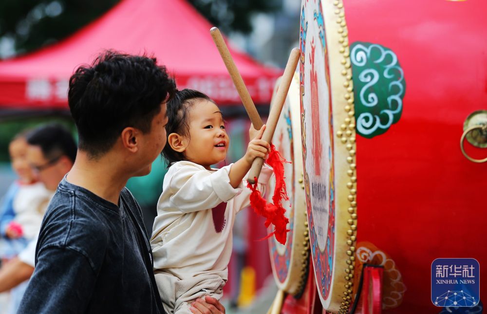 ↑ 10月6日,在山東省滕州漢畫像石館門外,家長陪著孩子體驗擊鼓。新華社發(fā)(李志軍攝)