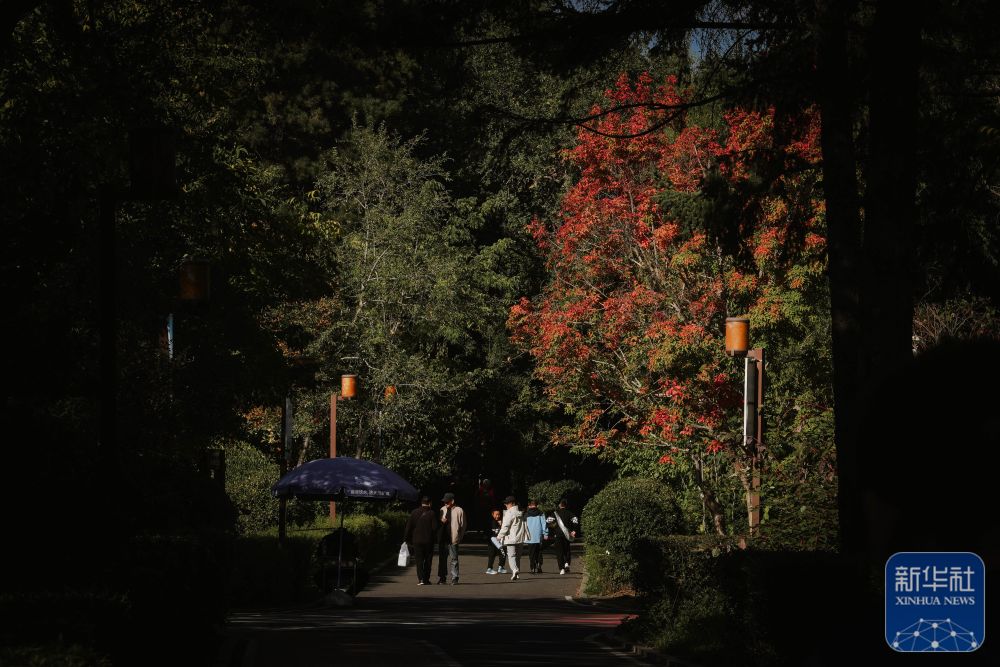 ↑ 10月6日,游客在長春市南湖公園觀賞紅葉。新華社記者 許暢 攝