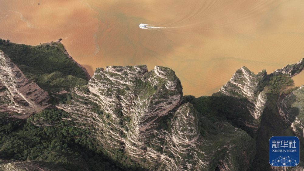 ↑ 10月6日,游客乘船在甘肅炳靈丹霞國家地質(zhì)公園游覽(無人機(jī)照片)。新華社發(fā)(史有東攝)