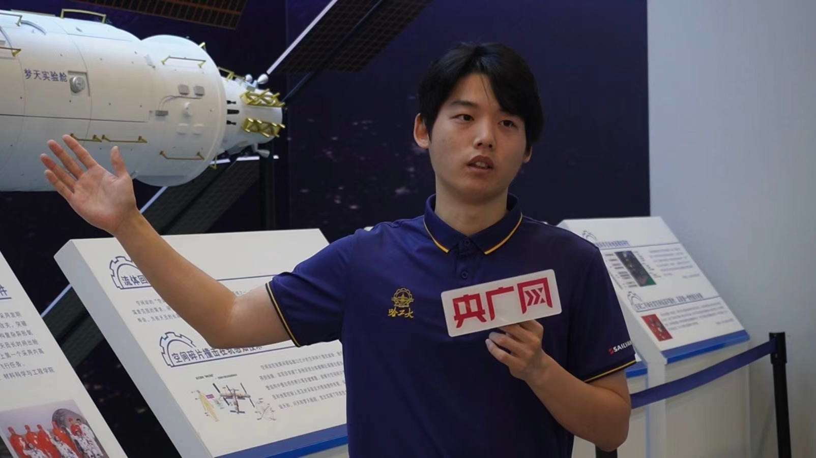 學(xué)生講解員郭鎮(zhèn)宇介紹由哈工大參與研制的問天實驗艙小機(jī)械臂(央廣網(wǎng)發(fā) 王語詩 攝)