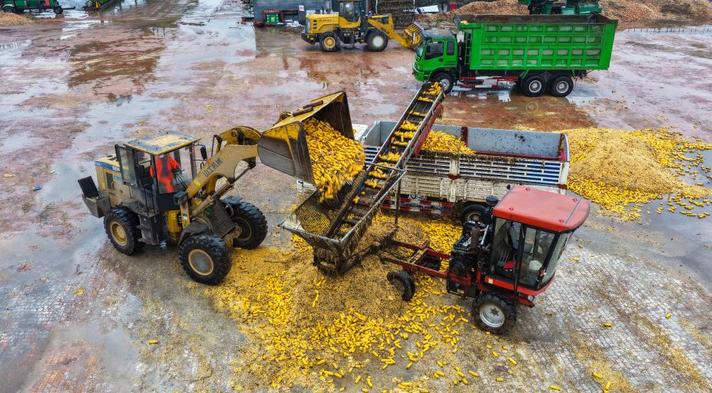 在菏澤市曹縣蘇集鎮(zhèn)一處農(nóng)田旁,收獲的玉米正在裝車。新華社記者葉婧 攝