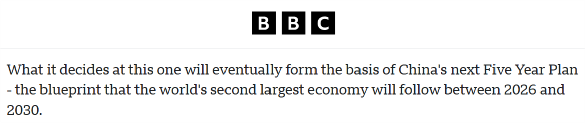 10月20日至23日,黨的二十屆四中全會(huì)在北京舉行。對(duì)此,英國廣播公司(BBC)19日?qǐng)?bào)道認(rèn)為,“此次會(huì)議所作的決定最終將成為中國下一個(gè)五年規(guī)劃的基礎(chǔ),而這一規(guī)劃將指引世界第二大經(jīng)濟(jì)體在2026年至2030年期間的發(fā)展方向”。