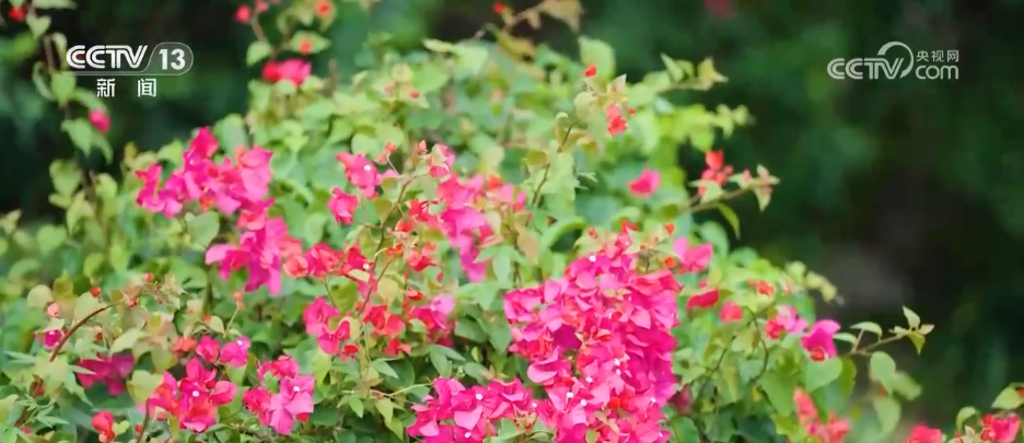 不同于北方秋日的層林盡染,這里的秋多了幾分獨有的鮮活暖意。漫步悠然園段步道,最先闖入視野的是成片熱烈盛放的三角梅,4萬多株三角梅沿著步道護欄蜿蜒鋪開,即便已過盛夏,花瓣依舊飽滿鮮亮。
