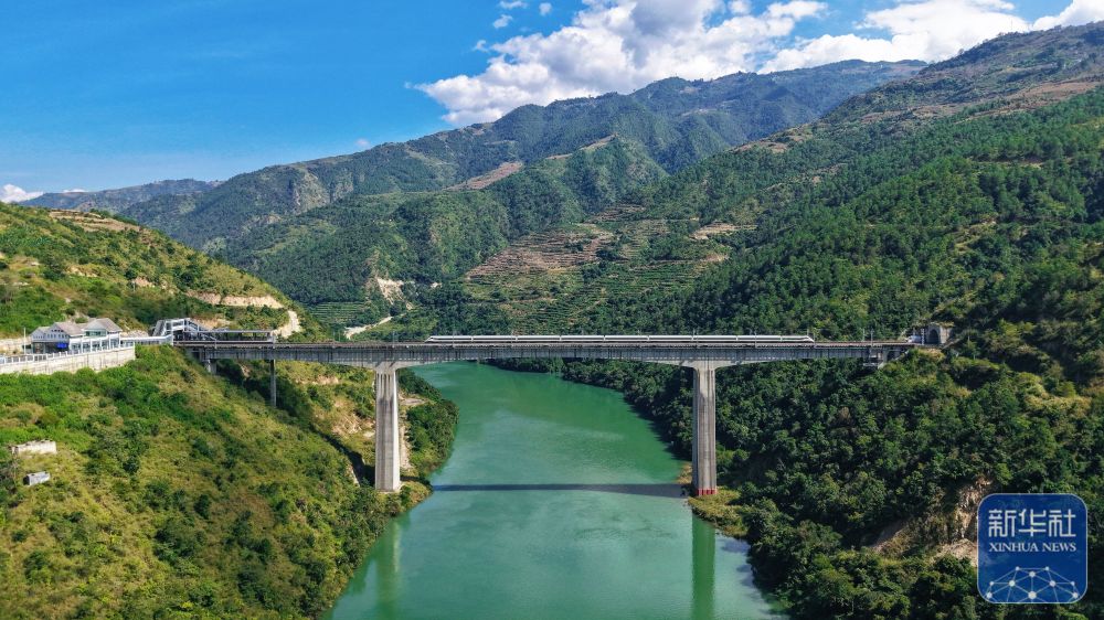 ↑ 10月30日,一列動車組列車經(jīng)過小灣東站(無人機(jī)照片)。