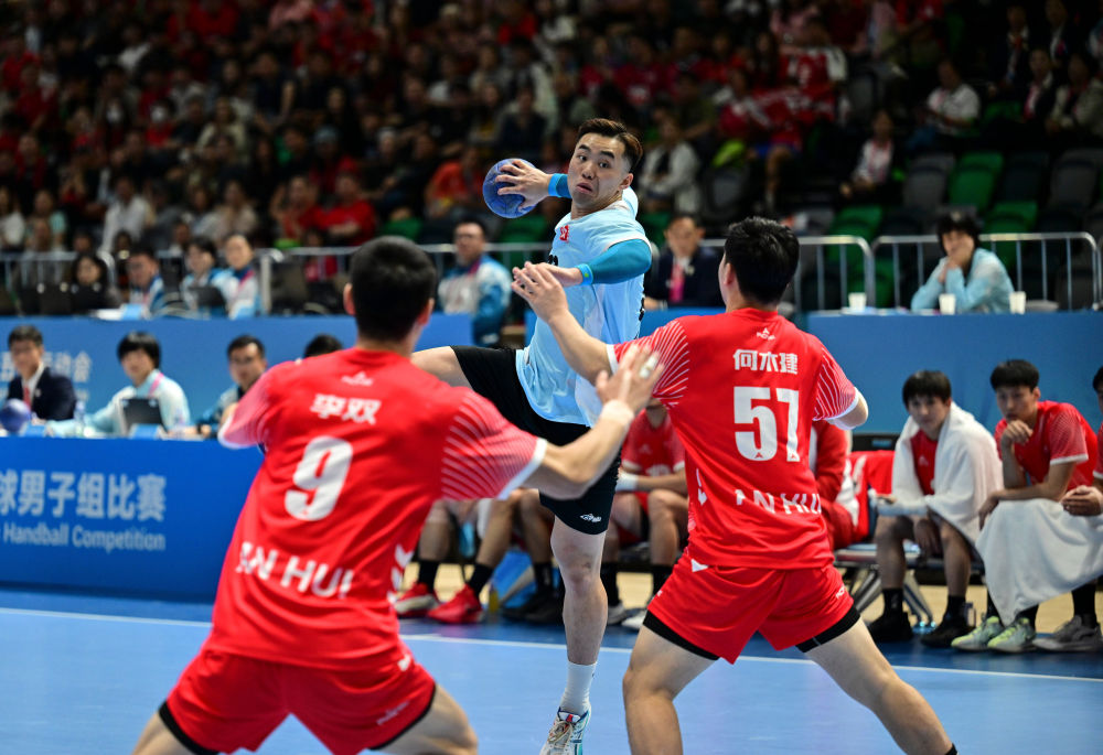 11月8日,在香港進(jìn)行的第十五屆全國(guó)運(yùn)動(dòng)會(huì)男子手球半決賽中,香港隊(duì)球員連潤(rùn)滔(中)在比賽中射門(mén)。新華社記者 于洋 攝