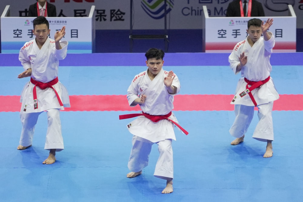 2025年11月6日,澳門代表隊(duì)在澳門舉行的第十五屆全國運(yùn)動會群眾比賽項(xiàng)目空手道男子業(yè)余組團(tuán)體型半決賽中。新華社發(fā)