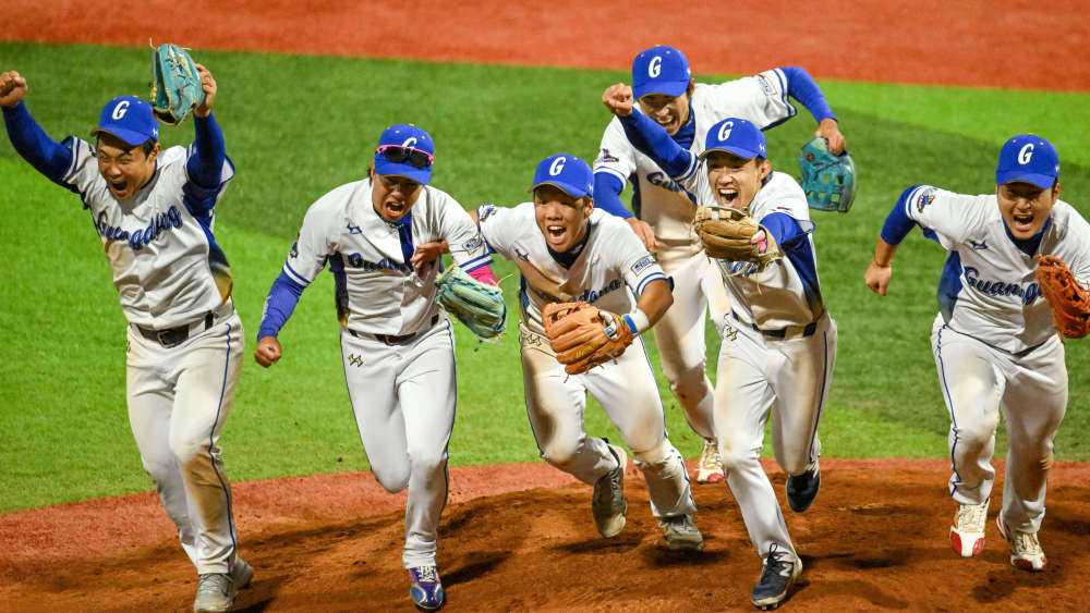 2025年11月19日,廣東隊(duì)球員在廣東中山舉行的第十五屆全國運(yùn)動會棒球1-4名交叉賽后慶祝勝利。新華社記者 丁磊 攝