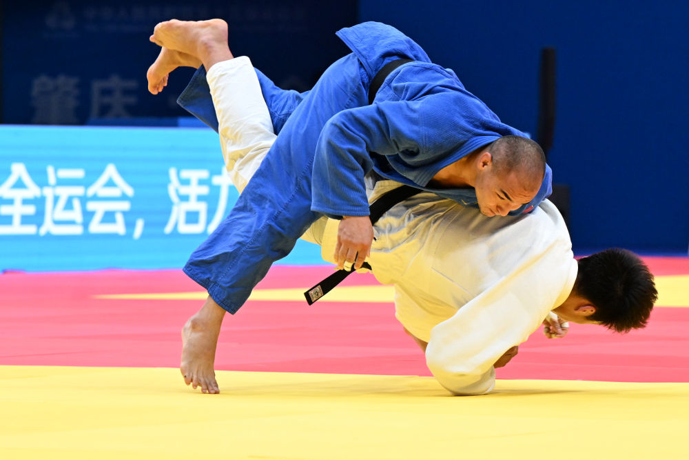 2025年11月12日,新疆隊(duì)選手阿卜杜熱西提·杰力力(上)和山東隊(duì)選手汪洋在廣東肇慶舉行的男子90公斤級銅牌賽中。新華社記者 朱祥 攝