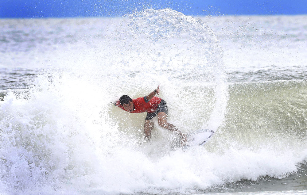 2025年11月13日,福建隊(duì)選手陳丙寅在廣東汕頭舉行的第十五屆全國運(yùn)動會沖浪男子短板第一輪比賽中。新華社記者盧漢欣攝