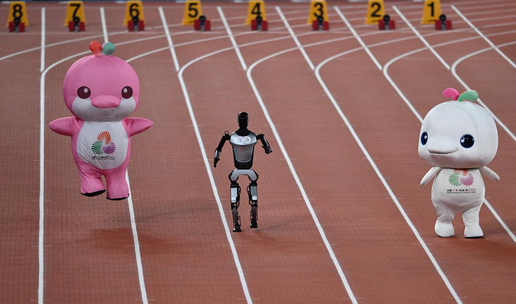 ↑11月17日,在田徑項(xiàng)目賽事開(kāi)始前的暖場(chǎng)活動(dòng)中,機(jī)器人和吉祥物喜洋洋、樂(lè)融融在廣東奧體中心體育場(chǎng)賽跑。新華社記者 周牧 攝