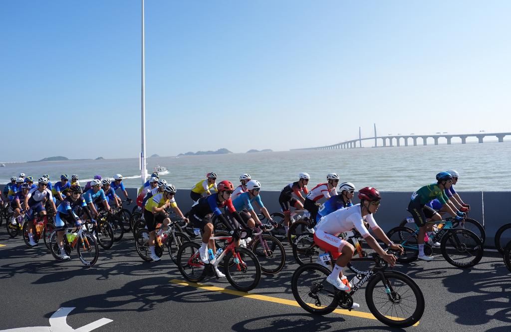 ↑11月8日,第十五屆全國(guó)運(yùn)動(dòng)會(huì)公路自行車男子個(gè)人賽決賽開(kāi)賽,全程231.8公里,選手將經(jīng)過(guò)港珠澳大橋,跨越粵港澳三地。新華社記者 顏麟蘊(yùn) 攝