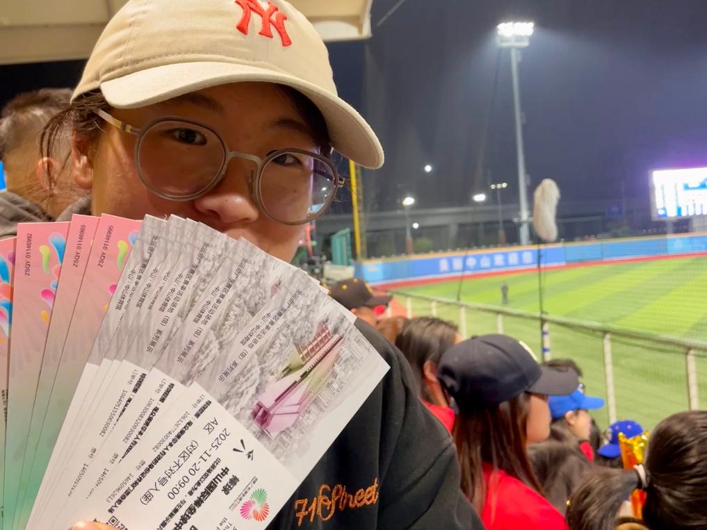 11月20日,一名觀眾在全運(yùn)會(huì)棒球比賽現(xiàn)場展示自己的票根。新華社記者霍思穎 攝