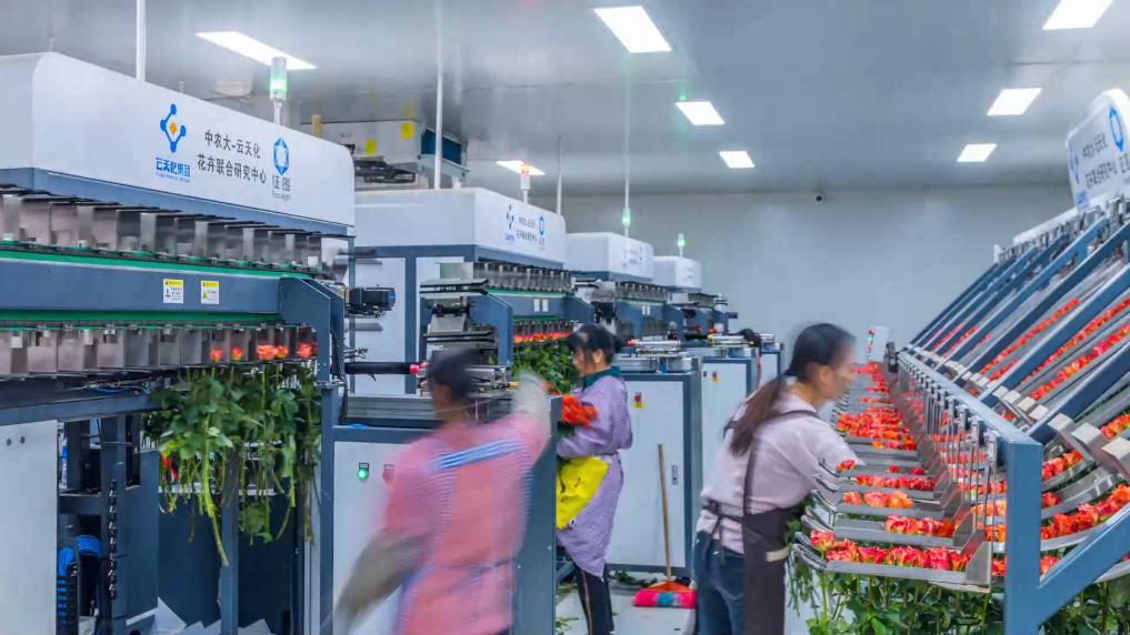 花卉大棚“智慧大腦”中央控制系統(tǒng)實時監(jiān)測與調(diào)控各類環(huán)境指標;智慧檢測控制水肥一體化循環(huán)系統(tǒng)確保植株健康生長;采后處理中心紅外成像識別系統(tǒng)實現(xiàn)自動分級分類,自動捆扎與包裝。