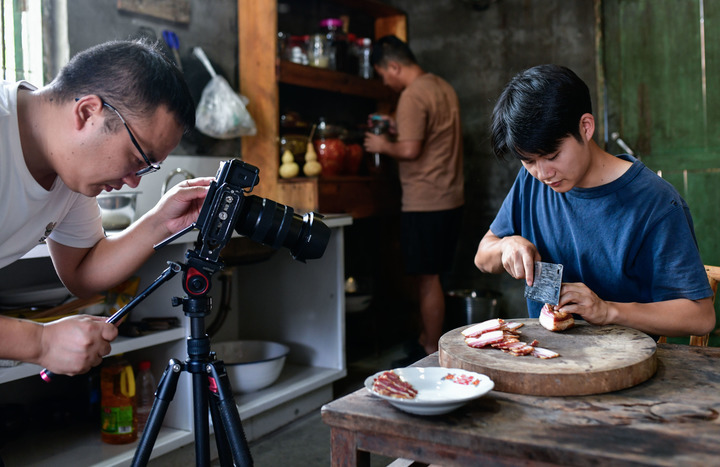 在貴州銅仁陳家寨村,“念鄉(xiāng)人周周團(tuán)隊(duì)”在村里拍攝短視頻。新華社記者 楊文斌 攝